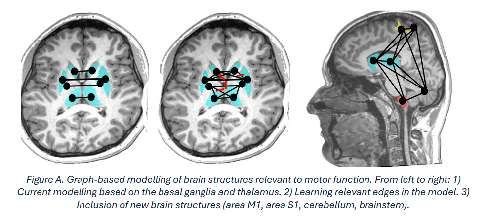 A first way to improve the model is to enrich the spatial relationships embedded in the graph edges and to automate the elimination of irrelevant edges in the GNN (Figure A-2) as recently proposed (Zheng, et al. 2020) (Sui, et al. 2024). The current work is based on a 2-to-2 connection between structures (Figure A-1) based on a priori. The challenge is to tackle a classic problem in graph data science, relating to learning the relevant topology of a graph to perform a specific task. A second option being considered is to enrich the graph by adding new nodes associated with other brain structures involved in the motor system (Figure A-3). In addition to the basal ganglia and thalamus currently considered, we wish to consider the primary motor area (movement execution), the cerebellum (movement coordination and adjustment) and the brainstem (transmission of motor impulses to the muscles).