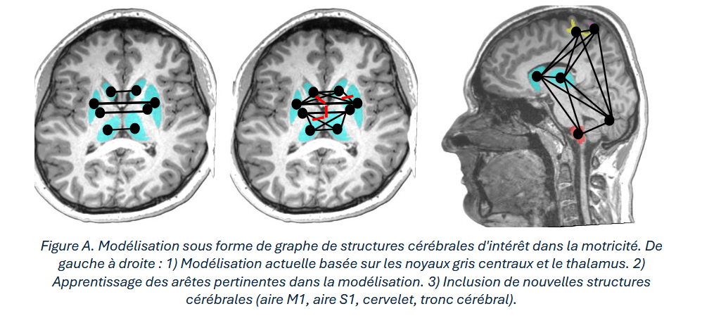 Environ 30% des enfants ayant eu un AVC néonatal ischémique développent des troubles moteurs permanents connus sous le terme de paralysie cérébrale (Chabrier, et al. 2019). L’étude de régions clés du cerveau peut aider à mieux comprendre les déficiences motrices manuelles provoquées (Craig, Carlson and Kirton 2019) (Hassett, et al. 2022) (Ilves, et al. 2022). La compréhension des phénomènes découlant de la présence de cette lésion cérébrale précoce peut s’appuyer sur une caractérisation par l’image. Dans nos précédents travaux, nous avons mis en évidence un lien entre les informations morphologiques extraites d’IRM morphométriques T1 et les fonctions motrices manuelles chez des enfants ayant eu un AVC néonatal (Coupeau, et al. 2024). La méthode proposée se base sur un réseau de neurones sur graphes (GNN) (Bacciu, et al. 2020) chargé de prédire les performances motrices de l’individu à partir d’un graphe du cerveau. Plus précisément, chaque structure d’intérêt du cerveau est représentée sous la forme d’un nœud embarquant des propriétés morphométriques issues de l’IRM T1 (Figure A-1). Les nœuds sont reliés par des arêtes apportant des informations sur les relations spatiales entre structures. Les résultats obtenus prometteurs restent perfectibles, notamment pour prédire la motricité fine.